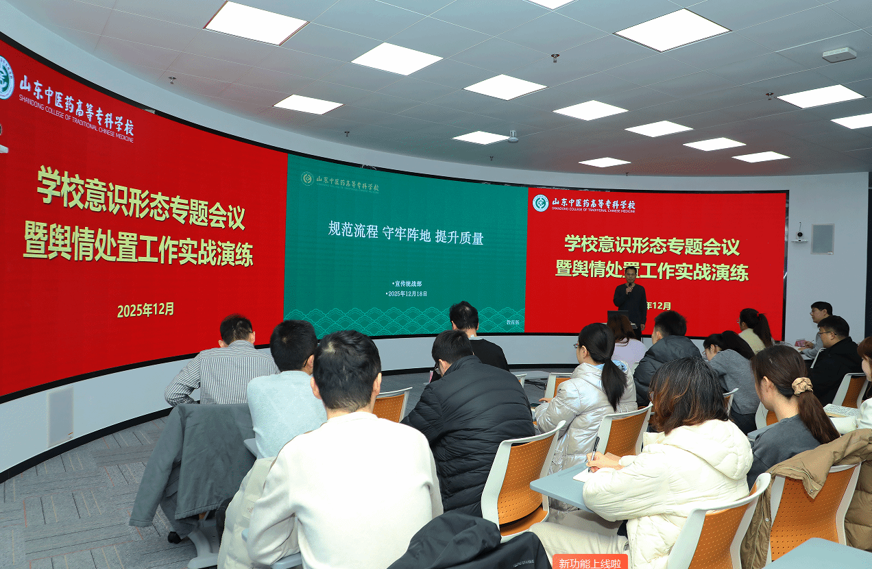 12月18日,学校在护理康养实验楼环形智慧教室召开意识形态工作专题会议暨舆情处置工作实战演练,宣传统战部、全校新闻宣传、舆情处置相关工作人员参加会议。